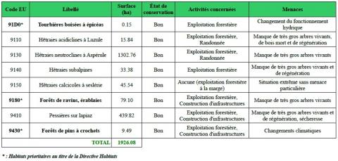 L'ensemble des milieux forestiers, qui représente 83 % du site, est en rapport avec l'exploitation forestière (infrastructures, exploitation,...) privée ou publique. Les habitats forestiers sont tous en bon voire très bon état de conservation. Aussi, le site Natura 2000 a une responsabilité particulière quant à la préservation de ces milieux forestiers montagnards et subalpins. Ces habitats accueillent des espèces remarquables, telles que la Rosalie des Alpes ou la Buxbaumie verte.