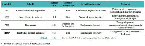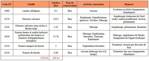 Sur 2 327 ha, 2 189 ha sont des habitats d'intérêt communautaire. Tout habitat confondu (d'intérêt communautaire ou non), le site présente une très forte dominante de milieux forestiers.