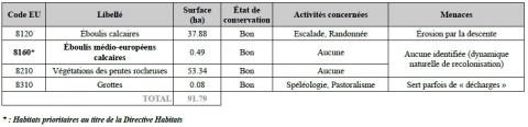 Cependant, une veille doit être mise en place car ces milieux restent ponctuellement sensibles (voie d'escalade, cueillette, balisage pour spéléologie, pollution atmosphérique, changements climatiques,...) et accueillent des espèces remarquables.